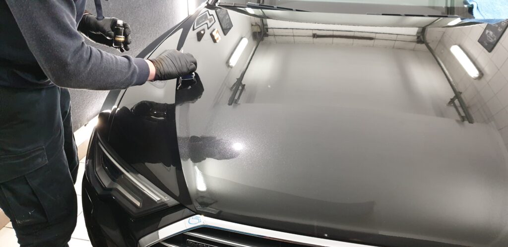 - Aplikacja powłoki – powłoka kwarcowa jest nakładana ręcznie, delikatnymi ruchami i przy użyciu specjalnych aplikatorów, które zapewniają równomierne pokrycie. Ważne jest, aby praca była wykonana w kontrolowanych warunkach, z dala od pyłu, a także innych czynników zewnętrznych, które mogłyby zaburzyć proces wiązania się powłoki z lakierem.